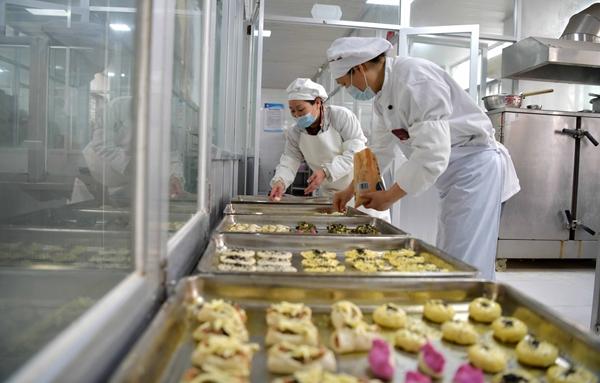 图为学校食堂人员用集采的面粉制作面点。东海县委宣传部供图
