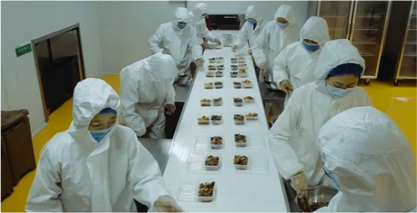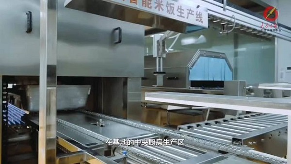 “这边是全自动米饭生产线,采用日本原装进口设备,能智能配米、配水,自动进行火候调节。”王军说,通过机械手操作和物联网互联,可精确计量用米量、出饭量、炊饭锅数等,两人操作即可满足4万人以上食用。