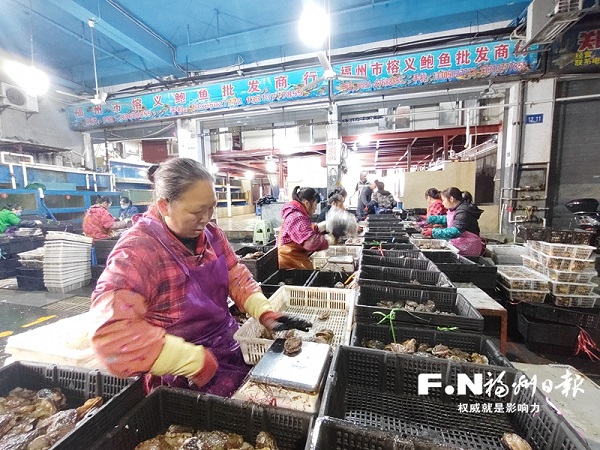 名成海峡水产品交易中心商户在分拣鲍鱼