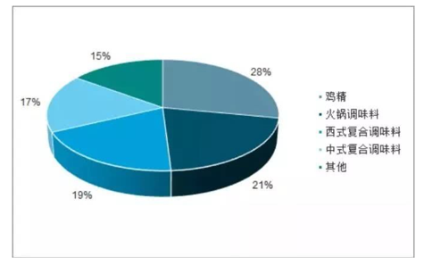 调味品按产品成份可分为基础调味品和复合调味品,复合调味料指以两种或以上原材料制成的调味料,共分为四个大类,分别是鸡精、火锅调味料、西式复合调味料和中式复合调味料等,2017年鸡精、火锅调味料、西式复合调味料和中式复合调味料分别占比28.0%、21.0%、19.0%、17.0%。