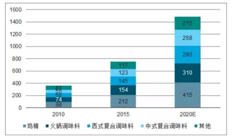 2017年中国调味品市场整体销售收入为3097.40亿元,2010年至2017年的CAGR为10.9%,保持稳定增长。2010-2015年复合调味料市场复合增速达16.1%,至2015年规模达751亿元,预计2015-2020年仍保持14.7%复合增速,增速高于调味品行业增速,至2020年市场规模达1488亿元。其中,预计中式复合调味料与火锅调料复合增速保持领先,分别为16.9%和15.0%,至2020年市场规模分别达268、310亿元。