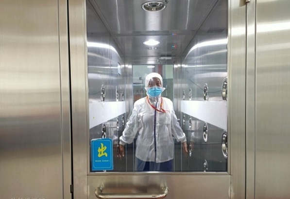 随后进入风淋室,一种通用性很强的局部净化设备,在不到一平方米的细长空间里站立,关上进出口的门,风淋喷嘴喷出高效过滤后的洁净强风,时长10秒。接下来使用粘毛器滚贴工作服上的毛发及异物,并在登记表上签字确认。