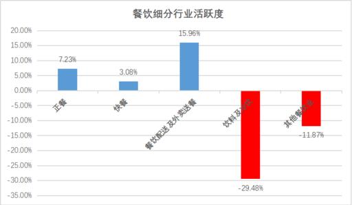 据人民数据(国家大数据灾备中心)资产服务平台数据统计,在餐饮行业中的正餐服务、快餐服务、饮料及冷饮服务、餐饮配送及外卖送餐服务、其他餐饮业分类中,从事餐饮配送及外卖送餐服务的企业活跃度明显高于其他,相较2019年活跃度增长15.96%,其次是正餐服务增长7.23%、快餐服务3.08%、其他餐饮业下降11.87%、饮料及冷饮服务下降29.48%。