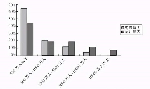 从团餐企业的中央厨房面积来看,区间1000—5000平面积的中央厨房最为普遍,几近于半数的企业在此范围内;从中央厨房的设计能力来看,团餐企业对建设中央厨房的自我评估中,设计能力在1000万人以下占团餐企业中的绝对数,但结合中央厨房实际的生产能力而言,数据显示75%的中央厨房设计能力大于实际能力,说明团餐企业中央厨房存在未实现满负荷运转的产能浪费。
