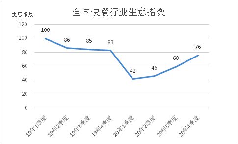 报告以2019年第一季度的评论总数为基准,各季度的评论总数除以基准的评论总数,再乘100得出餐饮行业的生意指数,该生意指数可展示出企业销售额的变化趋势。根据数据显示,2019年全国快餐行业经营达到了相对的高点后,随着疫情的冲击,2020年1、2季度的生意指数跌至不足一半的水平,疫情后也并没有恢复到原有的经营状况,反映出快餐行业相比于传统餐饮业所具有的轻资产小成本运营方式在抵御风险能力上还有待加强。