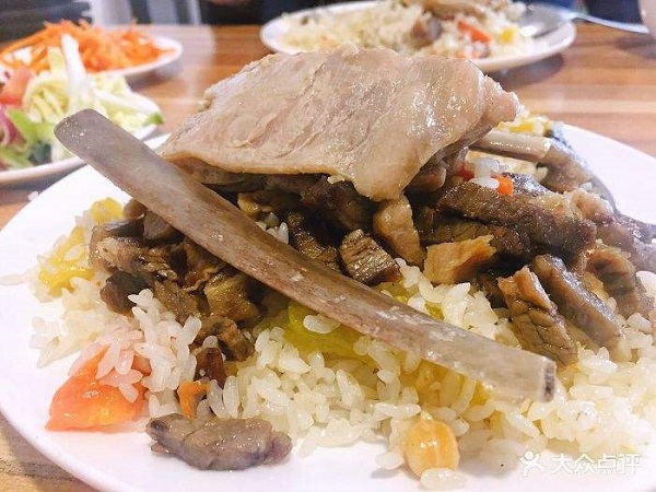 店内最具特色的牛排抓饭,是在开店一年后,不断有顾客提出想要“瘦一点的肉排”的要求后应运而生。色彩鲜亮的胡萝卜条,香气四溢的抓饭米粒,入口即化的白洋葱,搭配上经过胡椒、食盐、花椒等佐料6个小时的腌制,4个小时从大火快煮到小火慢炖的牛排。入口瞬间,胡萝卜的香甜、大米的醇香、牛排的鲜嫩多汁、小菜的酸辣爽口汇聚,再一咀嚼,多种香气同时在味蕾上绽放开来。
